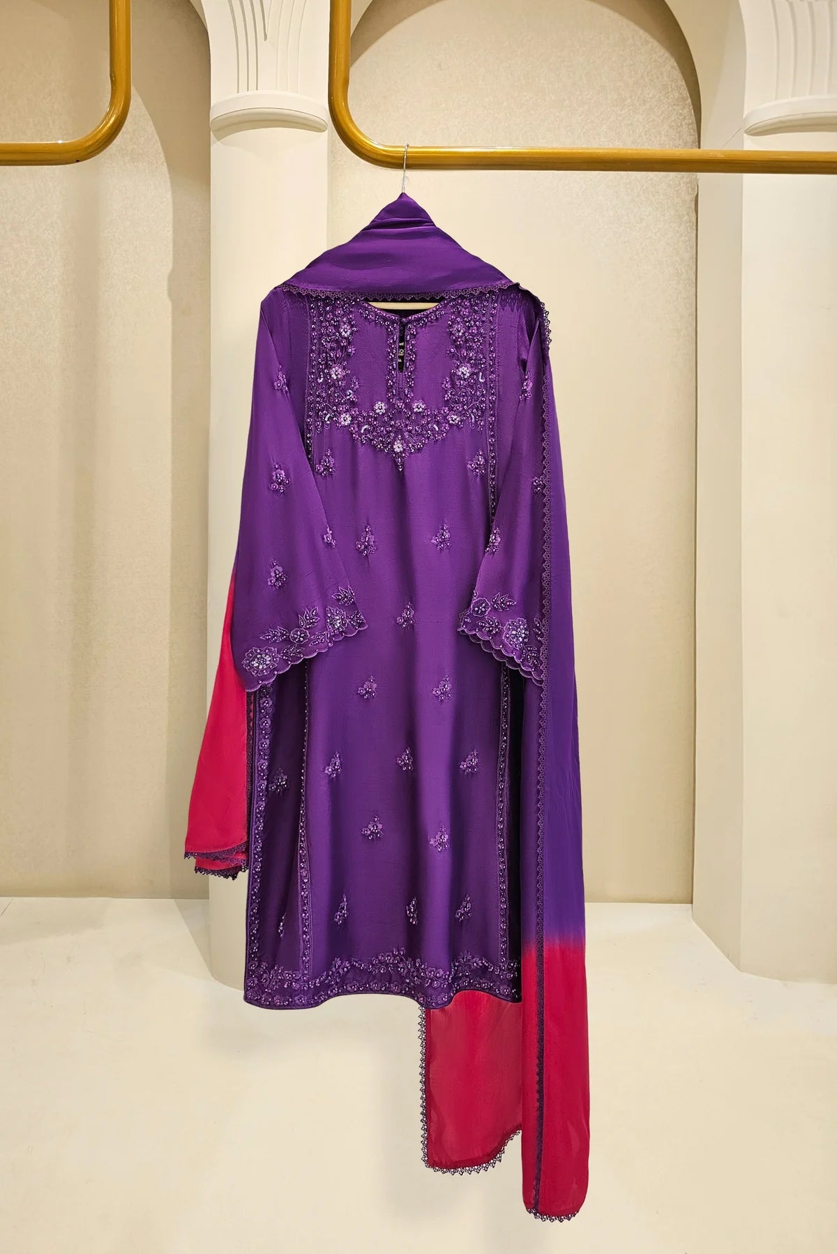Experience the art of effortless elegance with this stunning plum ensemble. " Ester " offering a modern yet timeless silhouette, adorned with floral blooms and subtle pearl accents throughout. The delicately flattering neckline, adds a touch of understated glamour. Paired with a pure raw silk Izaar, the look is completed with an exquisite tye dye medium silk dupatta. This ensemble exudes grace and sophistication, making it a beloved and essential addition to any wardrobe. The length of the long kameez is 48 inches.