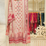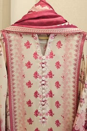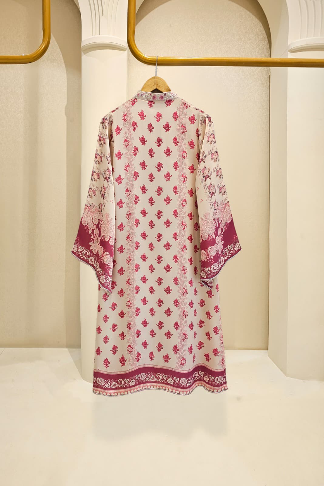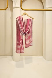 Experience the art of effortless elegance with the ethereal " Rosanne " ensemble. Offering a modern yet timeless silhouette on printed sheesha silk, adorned with subtle embroidered details. Paired with a matching pure raw silk trouser with a pretty feminine floral border, alongside a whimsical printed sheesha silk dupatta. This ensemble exudes grace and sophistication, making it a beloved and essential addition to any wardrobe. The length of the long kameez is 45 inches.