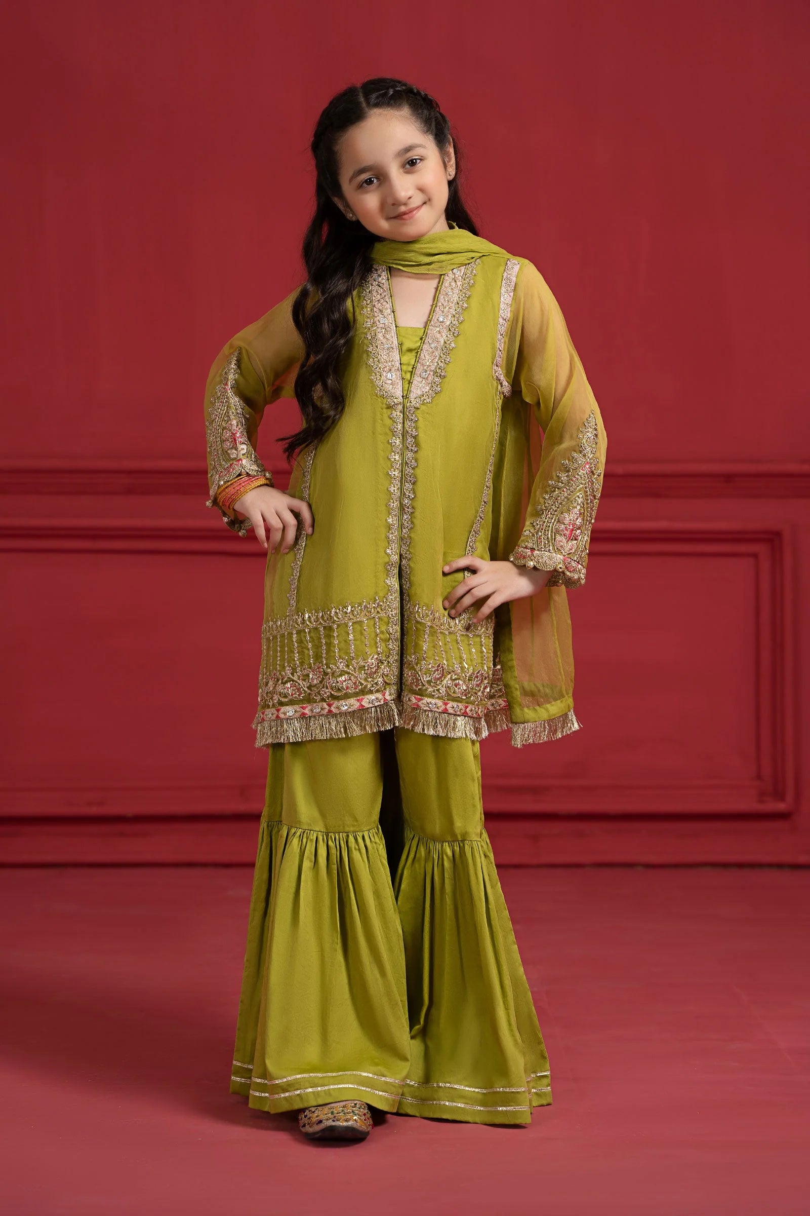 3-Piece (Paneled embroidered shirt with gharara and dupatta)