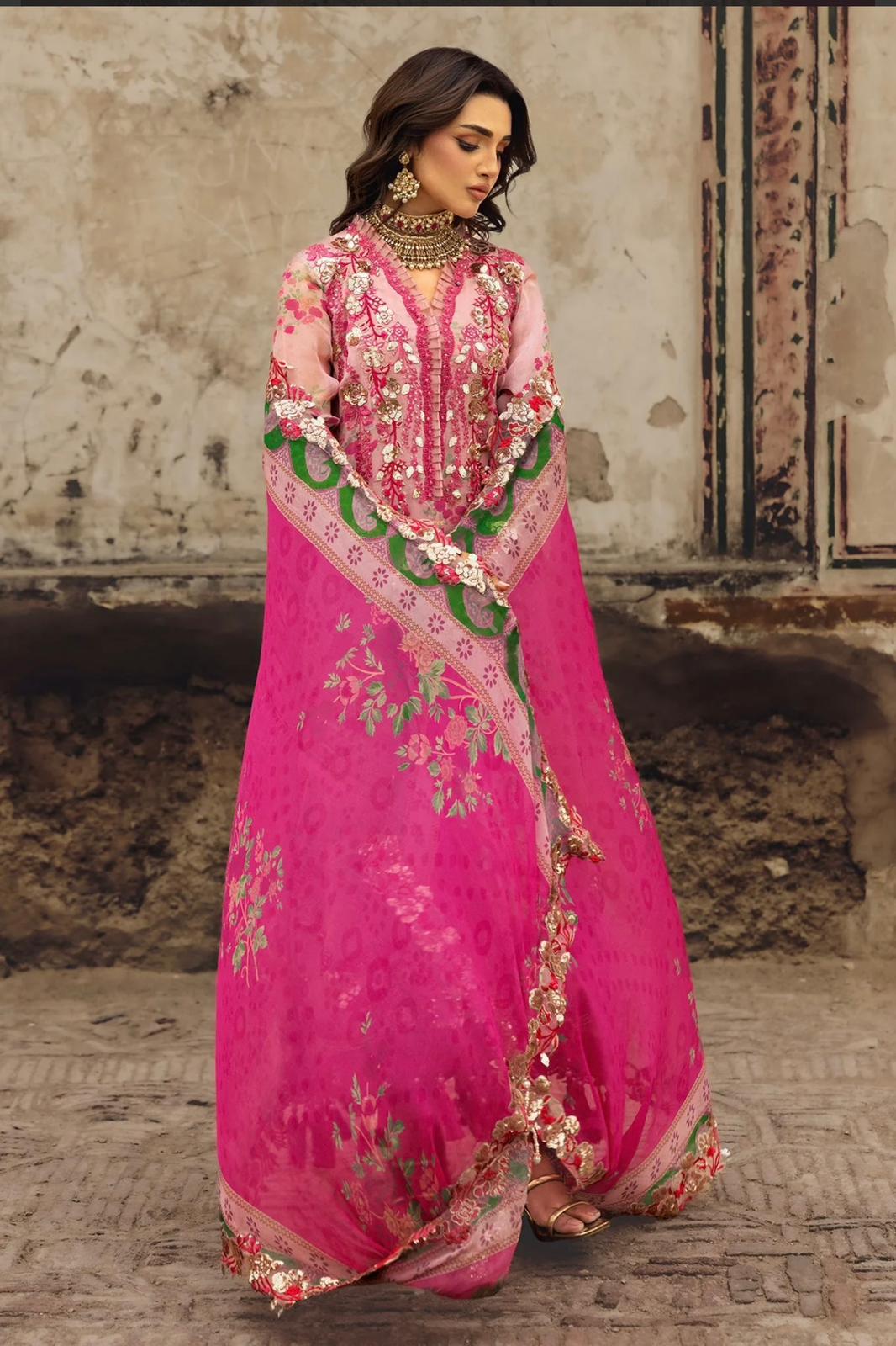 Paired with a matching embellished dupatta and coordinated trousers, this ensemble reflects Qalamkar’s signature craftsmanship and refined aesthetic. Crafted from premium chiffon fabric, it offers a lightweight feel with a luxurious drape—perfect for festive occasions, wedings, and formal celebrations.Qalamkar-inspired luxury design