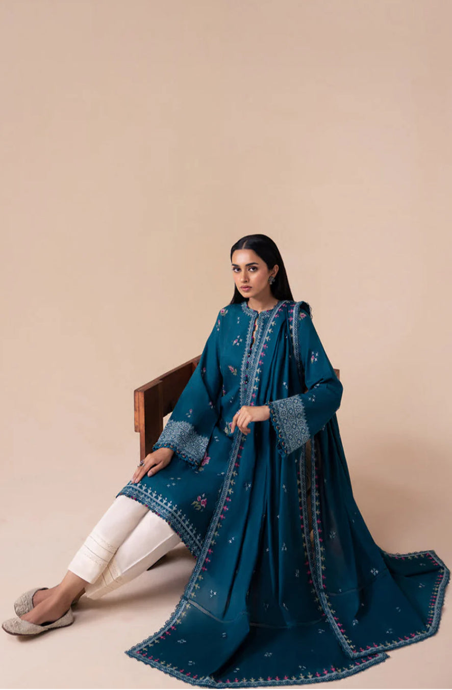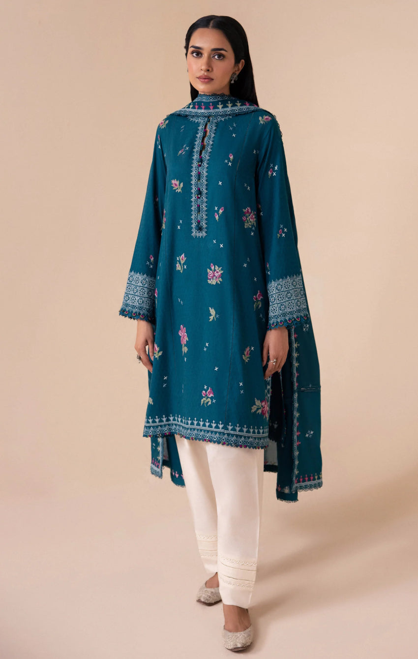 A teal canvas that beautifully captures the essence of fall, adorned with delicate embroidery in shades of pink, raspberry, ivory, sage, and ice blue. Intricate floral cross-stitch patterns dance across the fabric, weaving a mesmerizing tapestry of color and texture. The garment features an exquisite Broderie anglaise pattern, reminiscent of delicate lacework, which adds an air of sophistication and elegance.The luxurious dupatta is meticulously embroidered with blooming flowers on all four sides, showcasing unparalleled artistry. The thoughtful details of "Yashmi" evoke the harmonious transition of autumn, where nature’s vibrant hues blend seamlessly with the quiet elegance of the season's shift from summer to winter.