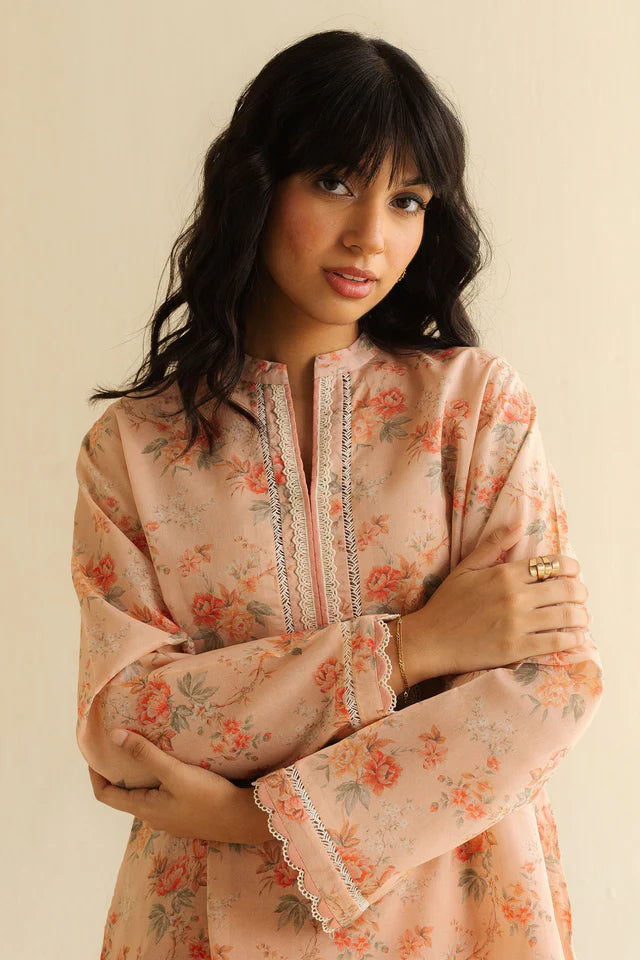 A peach summer set with delicate lace detailing on the neckline and sleeves. Paired with a cropped shalwar for a light and easygoing look.
