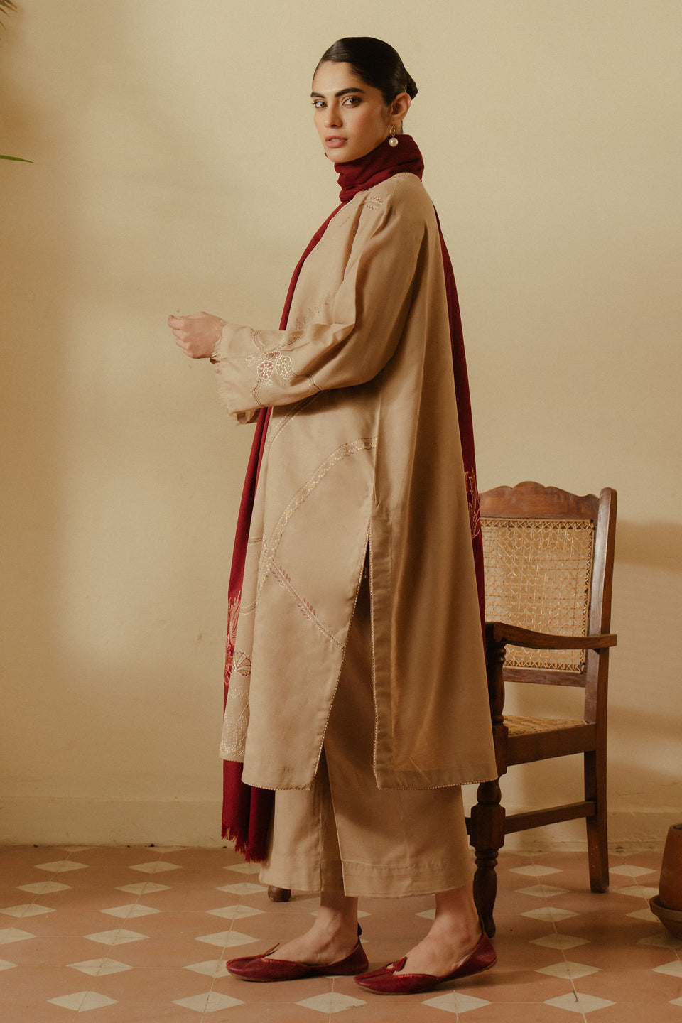 An oversized beige shirt with embroidery all over, paired with cropped wide hem pants and a contrasting red embroidered shawl.